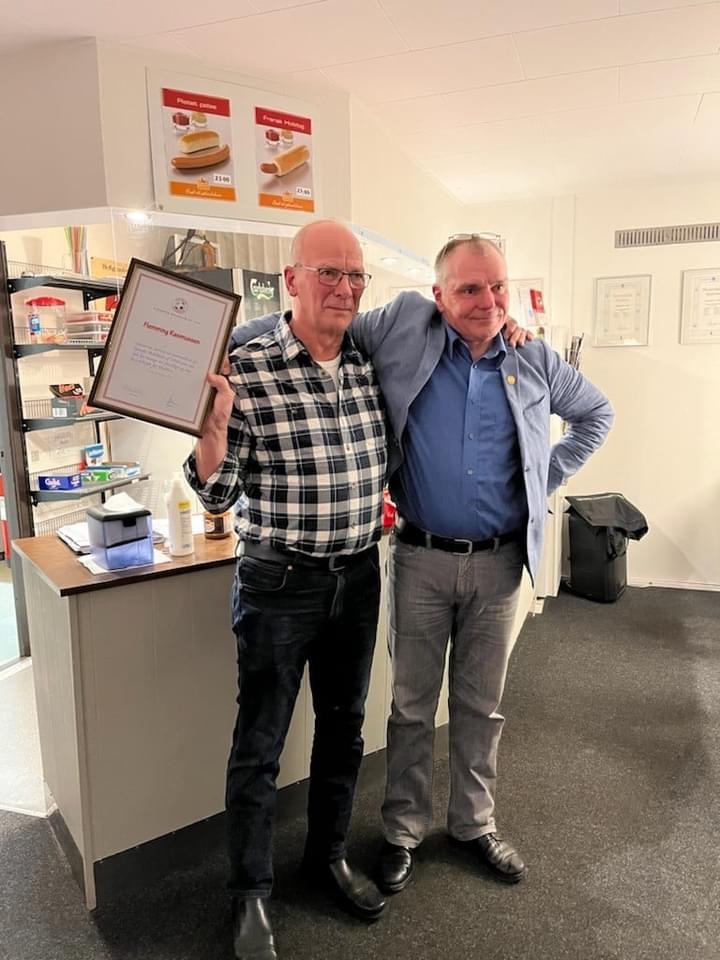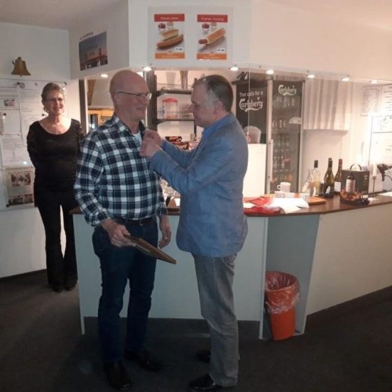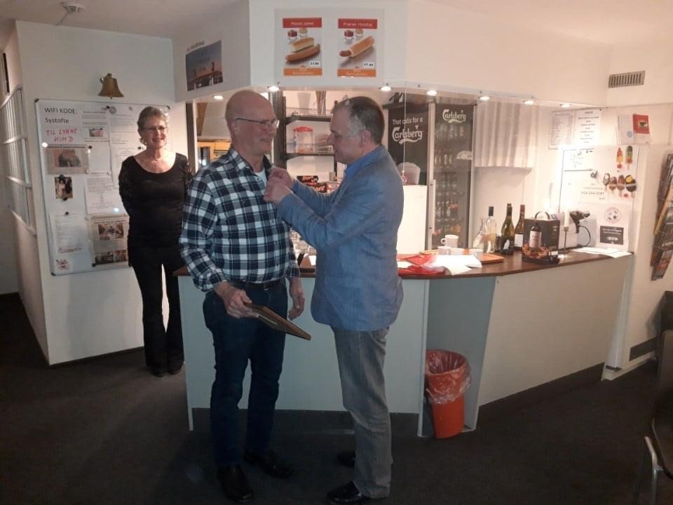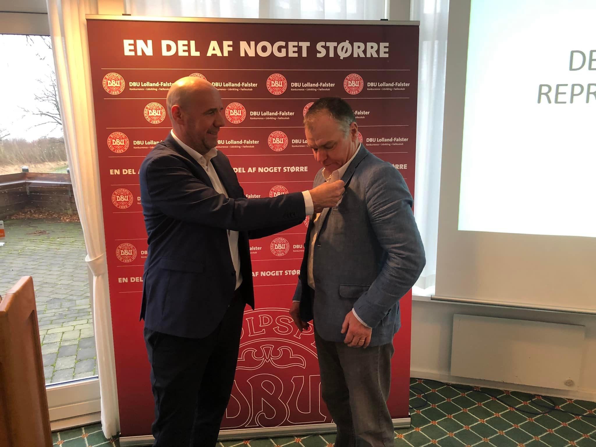 Kim får velfortjent nålen for snart 40 års ledergerning i Systofte Boldklub og til gavn for fodbolden på Lolland-Falster